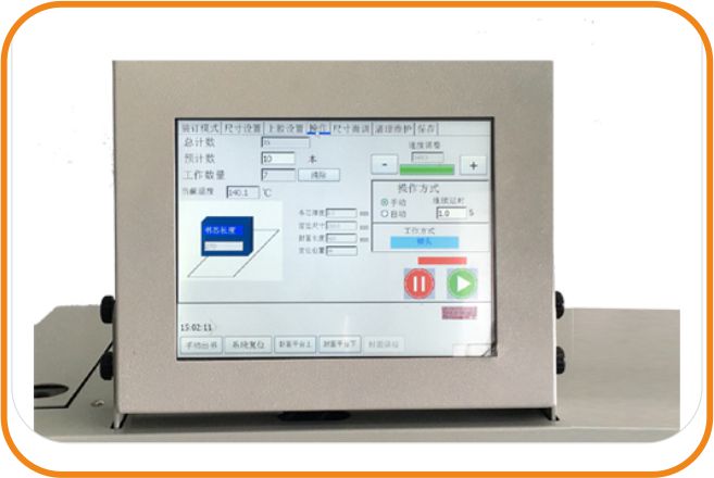 人機(jī)交互界面,中文文字與圖像相結(jié)合顯示10吋觸控主控彩屏,銑背深度、底膠和側(cè)膠量大小、壓痕位置和深度、斷膠位置、方圓脊等均可方便設(shè)定調(diào)整,具備操作記錄、數(shù)據(jù)存儲(chǔ)、工效統(tǒng)計(jì)等功能。